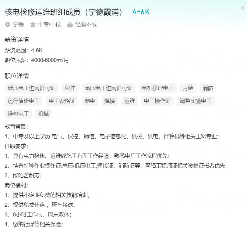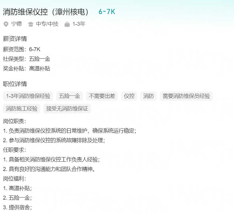 初、中、高级工作负责人 消费维保仪控(漳州核电) 核电检修运维班组成员(宁德霞浦) 核电站长协工程师(福清核电)
