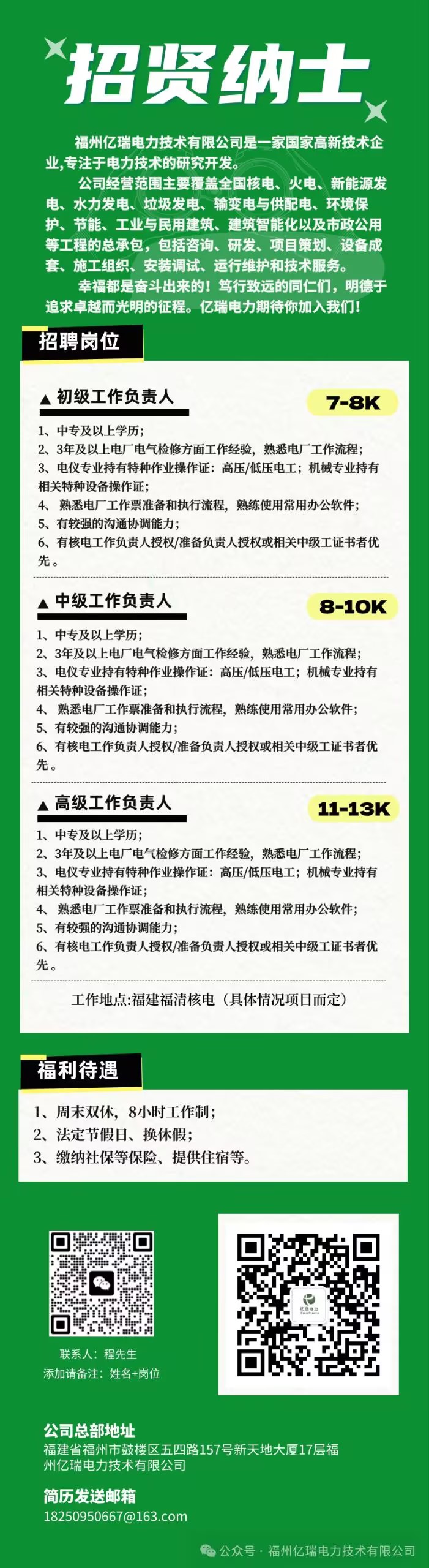 初、中、高级工作负责人 消费维保仪控(漳州核电) 核电检修运维班组成员(宁德霞浦) 核电站长协工程师(福清核电)